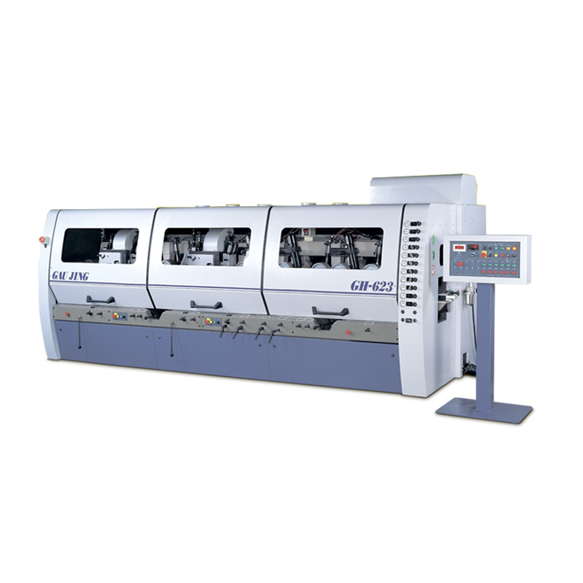 Eliminating the conventional design concepts on a 4-side moulder, GAU JING R&D staffs spent great efforts in analyzing the high speed machining technology, & successfully presented a new generation high speed moulder. The GH series integrates many outstanding features, such as rugged machine structure, rigid spindle assembly, maximum cutting stability, precision spinles, Combined with specially designed hydraulic supports on horizontal spindle ends. It set up a new standard for a high speed 4-side moulder.