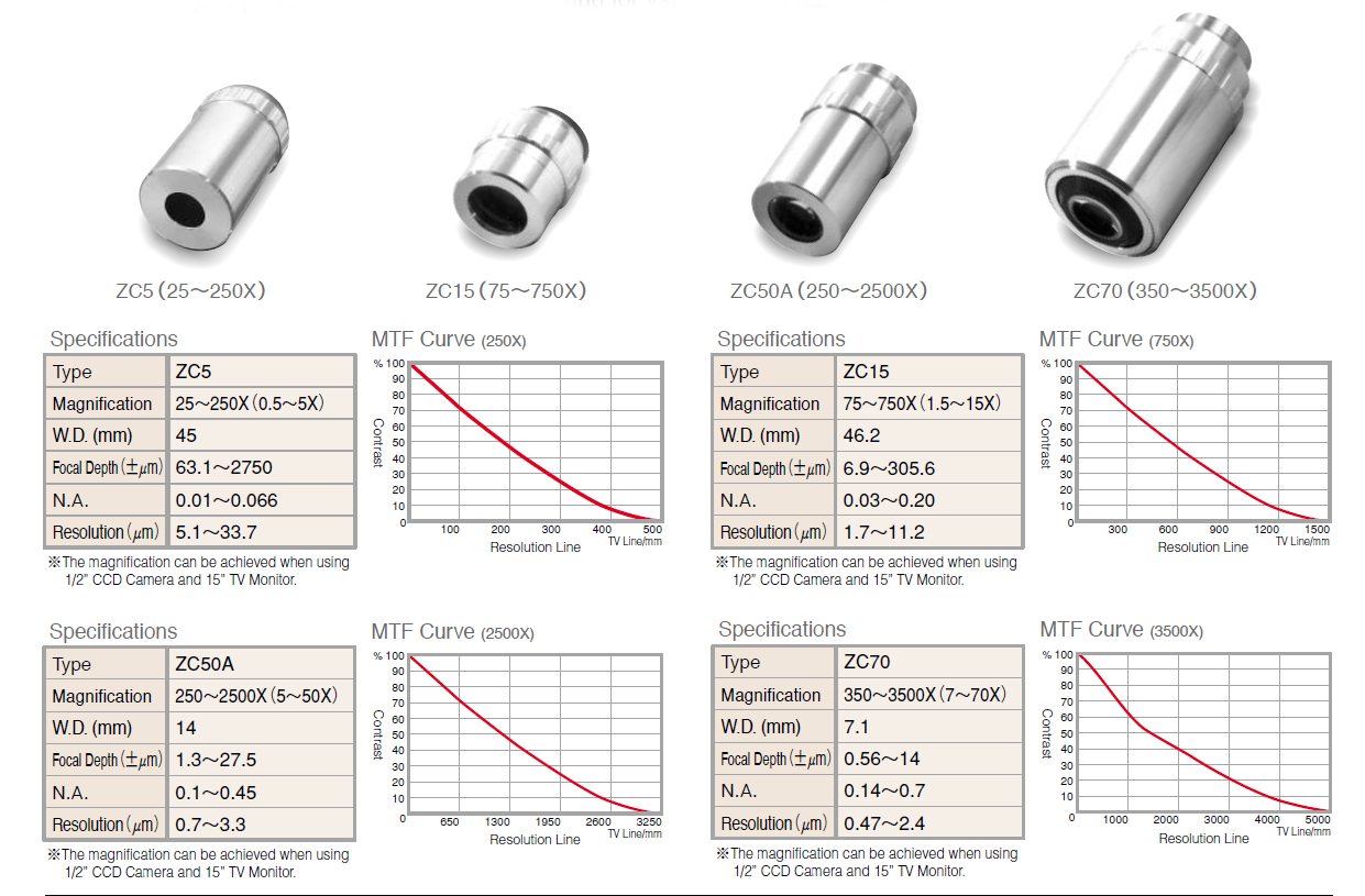 The lenses produced by Union Optical can assure stable high quality performance by adopting there three technologies. These valuable technology know-hows, which are developed during long time, bring out the high-quality and high-resolution images. ZC series objectives are much suitable for research, production, testing and inspecting, to pursue the best image processing for various observation needs.