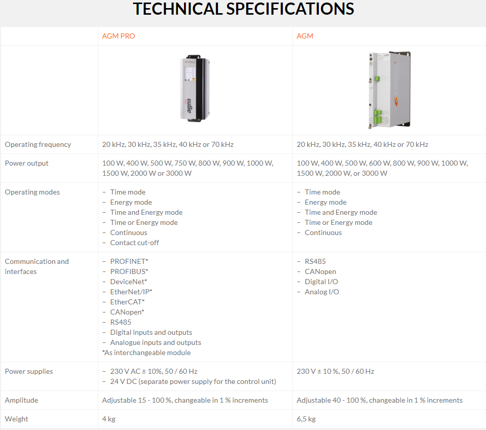 The AGM Pro generators can be integrated easily into the existing system using fieldbus interfaces. Certified* communication protocols available for use: PROFINET*, PROFIBUS, DeviceNet*, EtherNet/IP*, EtherCAT* and CANopen*. It is also possible to establish communication with the ultrasonic generators via RS485 plus digital and analogue inputs and outputs.