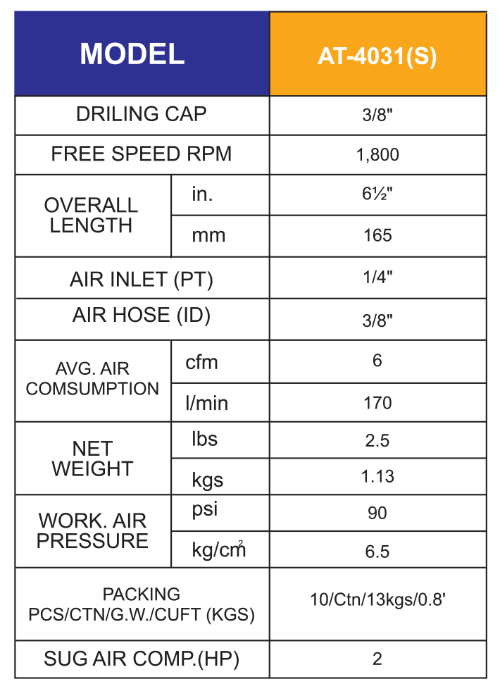 AT-4031 : 3/8" Reversible Air Drill (With Keyless Chuck)