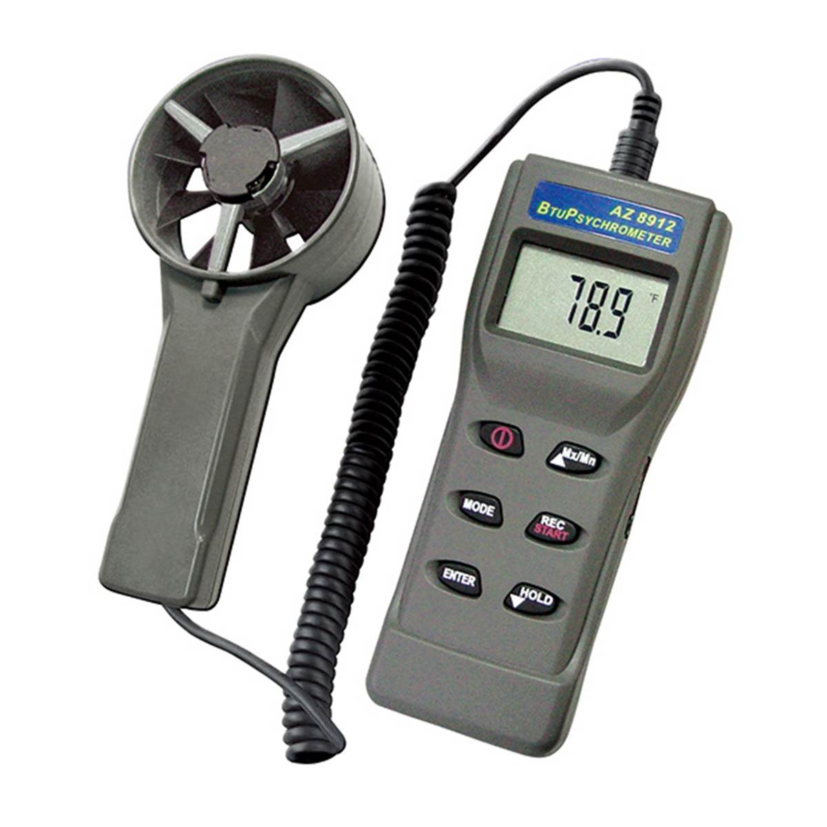 The 8912 AZ wind speed meter has the remote fan to measure the Air Speed, Air Velocity, Air Volume, BTU capacity measurement, Temp., Humidity, dew point and wet bulb temperature.