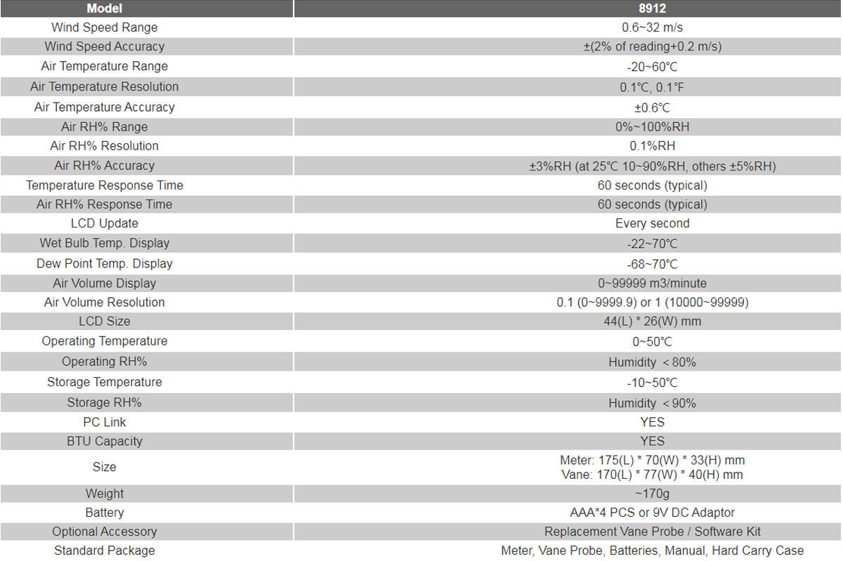 The 8912 AZ Anemometer is the best choice as the wind speed monitoring device in HVAC (Heating, Ventilation, Air Conditioning and Refrigerating) or industrial related application.