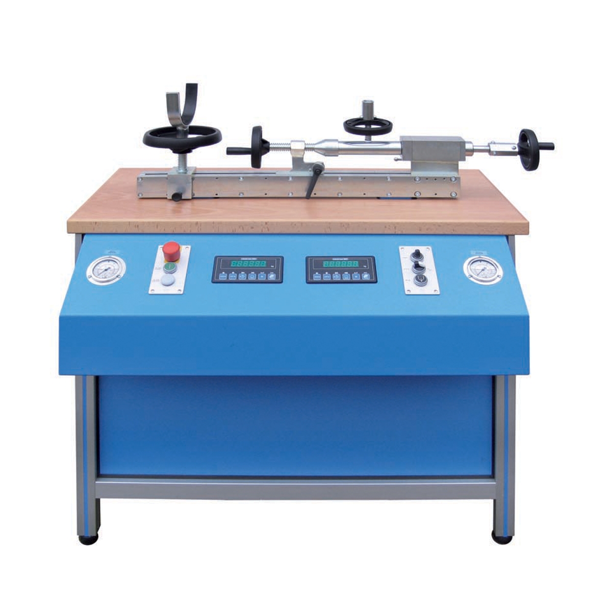 CO2-filling unit KU6 suitable to fill any size, shape or make of CO2-cartridges (from 20 g) and CO2-bottles (up to 6 kg) with the universal filling head. CO2-unit with integrated digital scale 30 kg in table form with 40 mm thick wooden board.