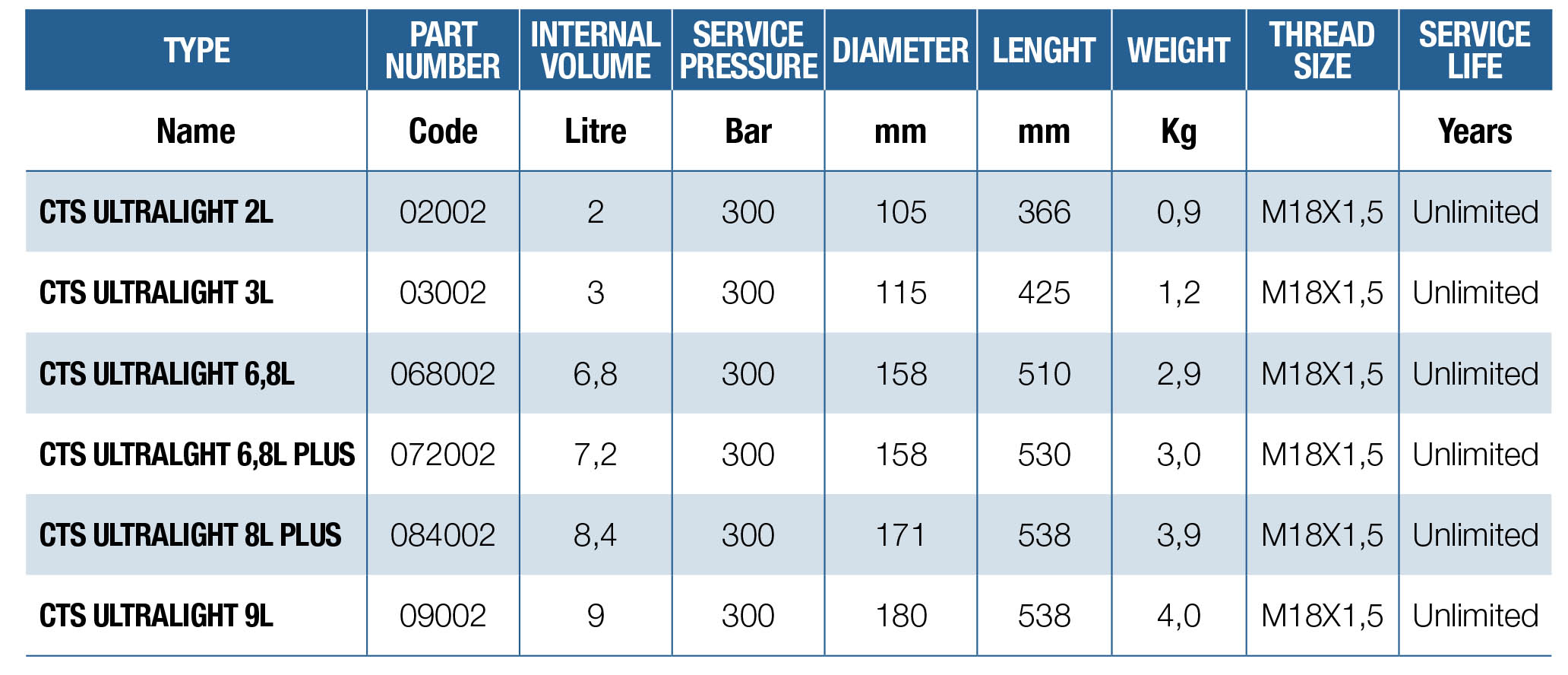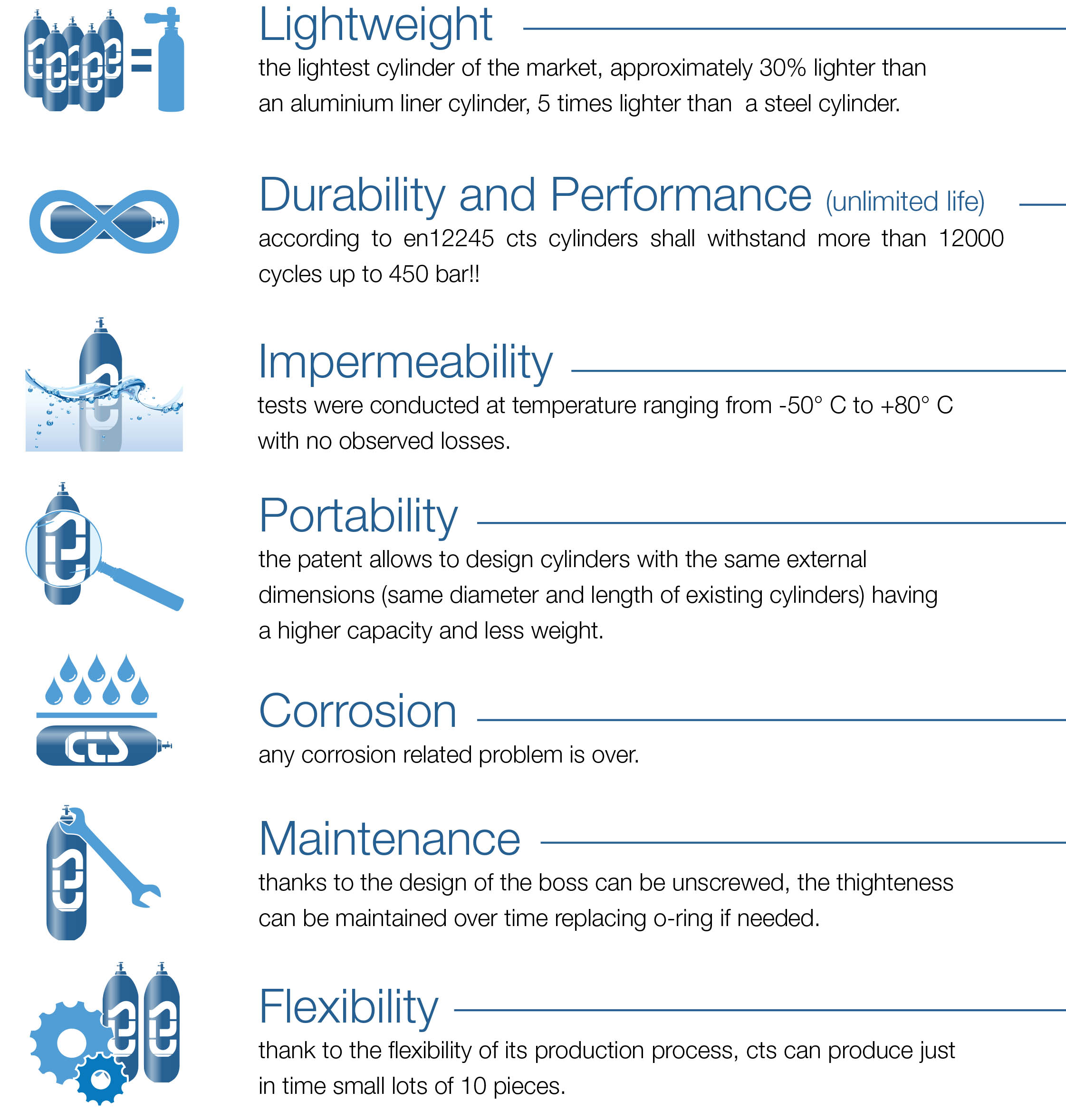 CTS has developed an innovative technology for the production of new types of type 4 composite cylinders with an ultralight liner made of PET (polyethylene terephthalate) and a much higher impermeability to gases (40 to 100 times more resistant than HDPE), containing the costs and increasing product reliability. This technology has been developed starting from type 1 cylinders (made of steel or an aluminum alloy) and has gradually evolved into types 2 and 3 (with a structural metal liner), and finally into Type 4 cylinders.
