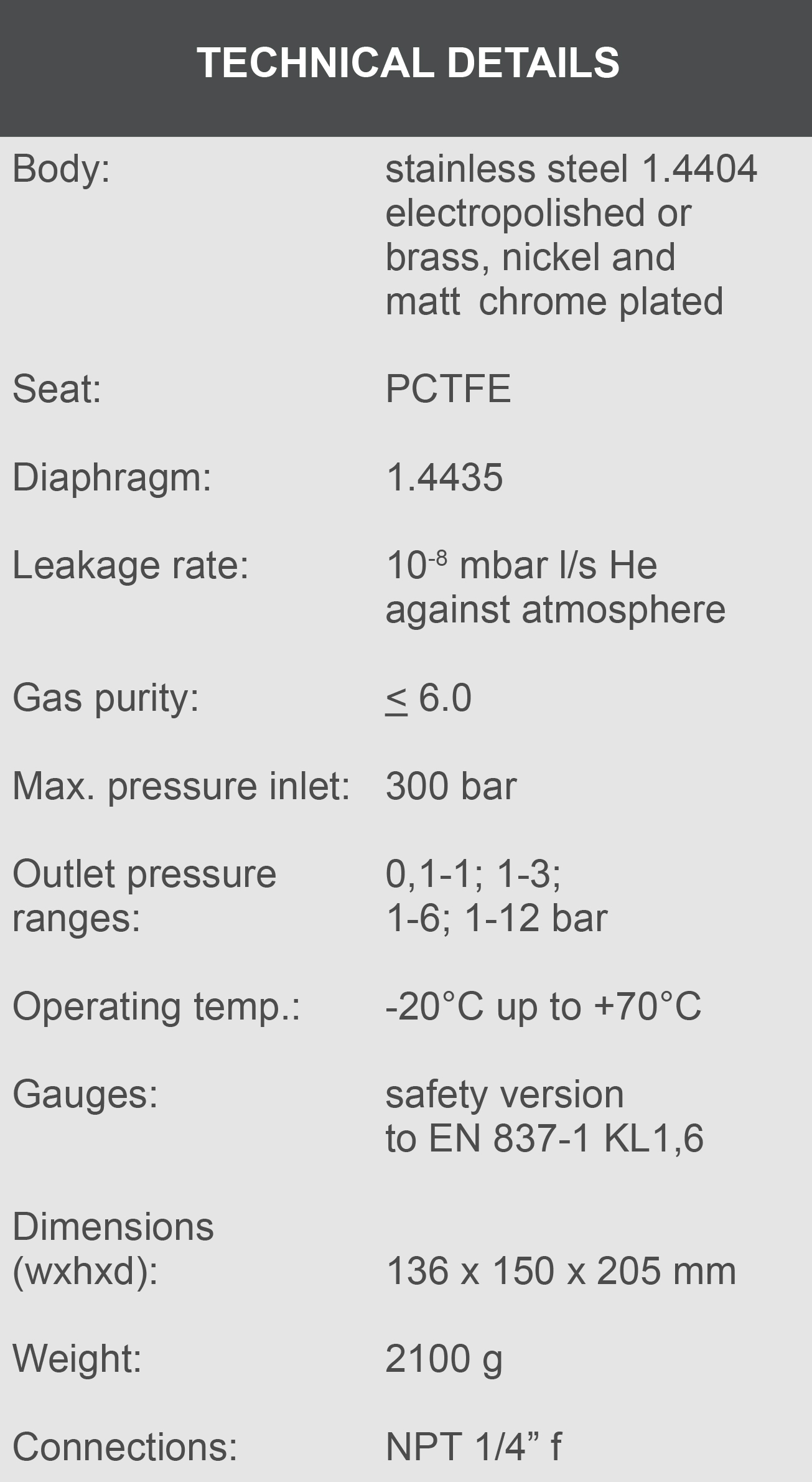 Especially for gases with high requirements on purity up to 6.0 and for laboratories and analytics.