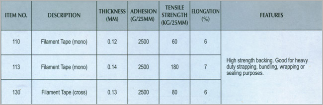 Filament Tape - is a clear polyester film backed tape, reinforced with continuous fibreglass yarn filaments. It has a very aggresive rubber / resin blend adhesive system. It provides excellent abrasion, moisture, and scuff resistance, and also has very good adhesion to its own backing.