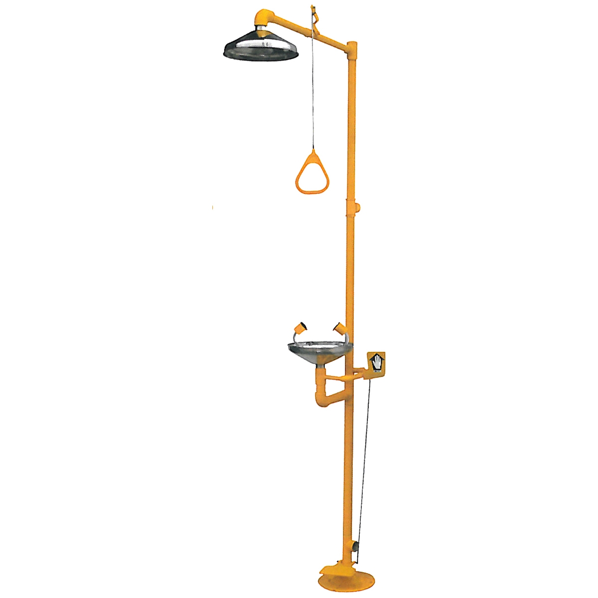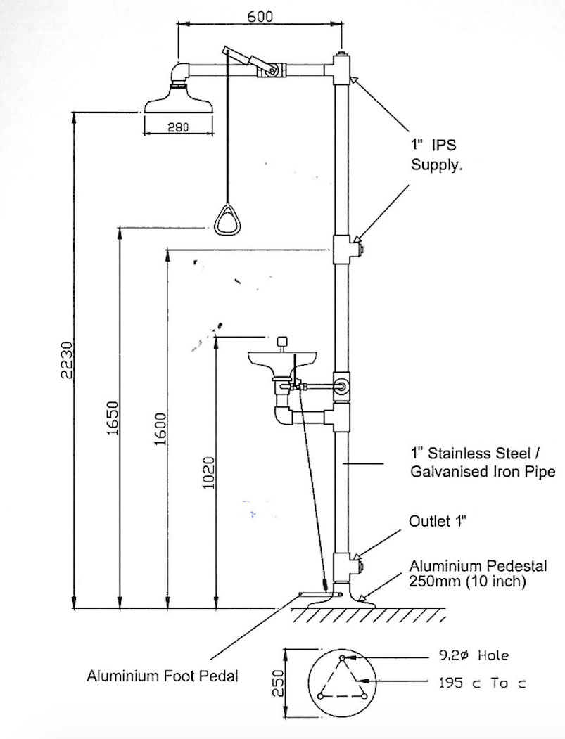 Eyewash Assembly: Stainless steel with ABS sprayheads assembly with twin soft-flow eyewash heads and instant flip-open protective dust cover. The built in automatic compensating valve assures safe steady flow under varying water supply conditions.