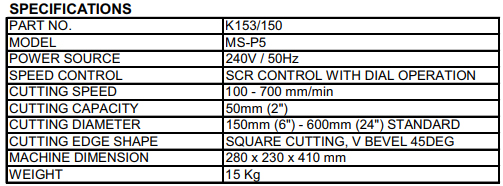 SPECIFICATIONS APPLICATIONS * Widely used in machinery, ship building, chemical boiler industries PART NO. K153/150 MODEL MS-P5 POWER SOURCE 240V / 50Hz SPEED CONTROL CUTTING SPEED 100 - 700 mm/min SCR CONTROL WITH DIAL OPERATION CUTTING CAPACITY 50mm (2") CUTTING DIAMETER 150mm (6") - 600mm (24") STANDARD WEIGHT 15 Kg CUTTING EDGE SHAPE SQUARE CUTTING, V BEVEL 45DEG MACHINE DIMENSION 280 x 230 x 410 mm