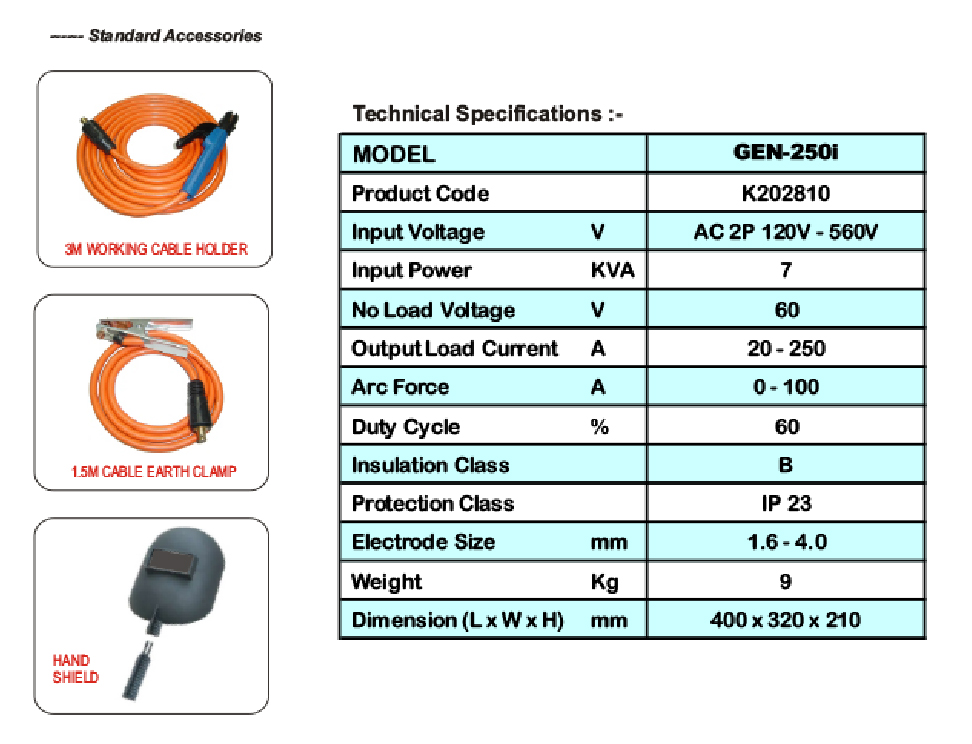 - Easy starting & excellent arc characteristics with Stainless Steel, Bronze, Aluminium & Cast Iron Electrode up to 4.0mm electrodes