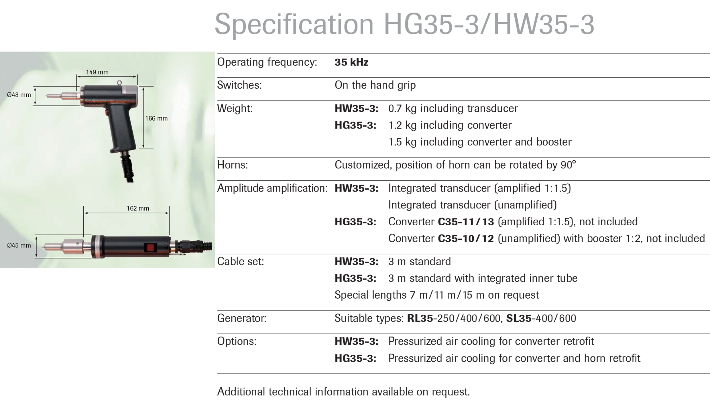 The ultrasonic hand welding units HW are suitable for manual welding and cutting operations of thermoplastic and non-woven parts.