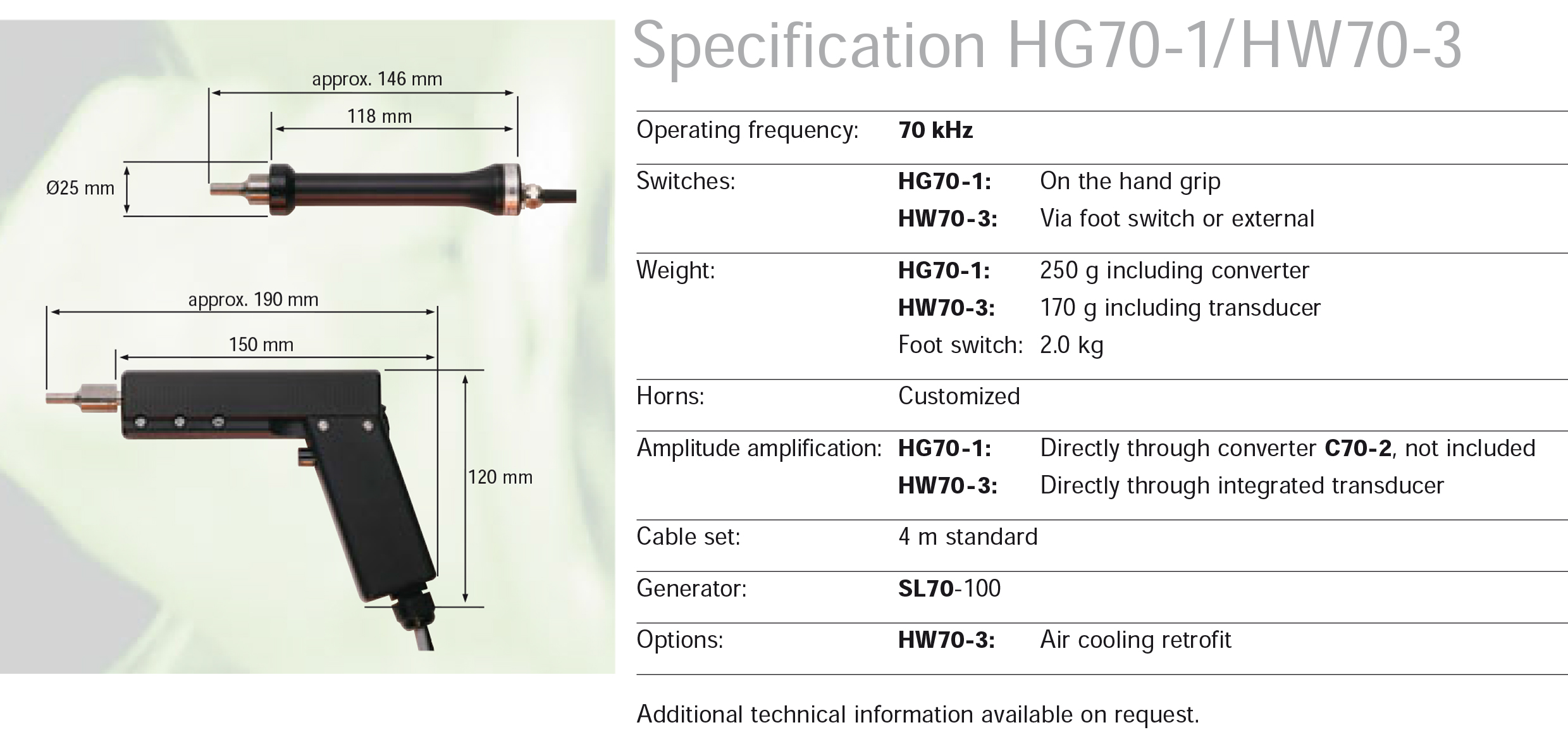 Ideal for spot welding, riveting, beading or cutting with template horns, Very small and light devices for ergonomic working, HW70-3 additionally designed for the assembly into special purpose machines