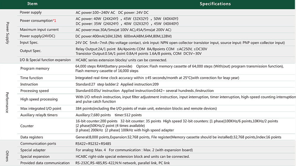 CPU&BPU Dual-core design, 50ns basic instruction, High-speed field bus, Max.256 Points, 8-channel 200KHz high-speed input, 4-channel 200Khz high-speed output, 64K memory, 3-channel serial communication port, Modbus master & slave station, Ethernet module, EtherCAT, High dielectric withstand voltage, Greater transistor output, Vibration resistance connector, LCD display, Independent power supply terminal (red), Offline download, IO terminal
