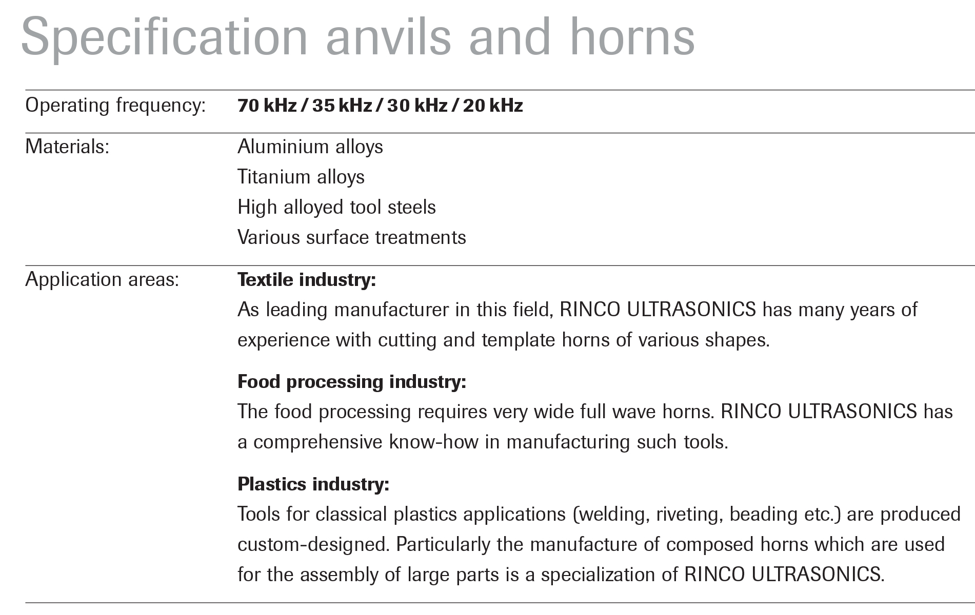 The tools manufactured by RINCO ULTRASONICS are suitable for welding and cutting operations of various kinds.