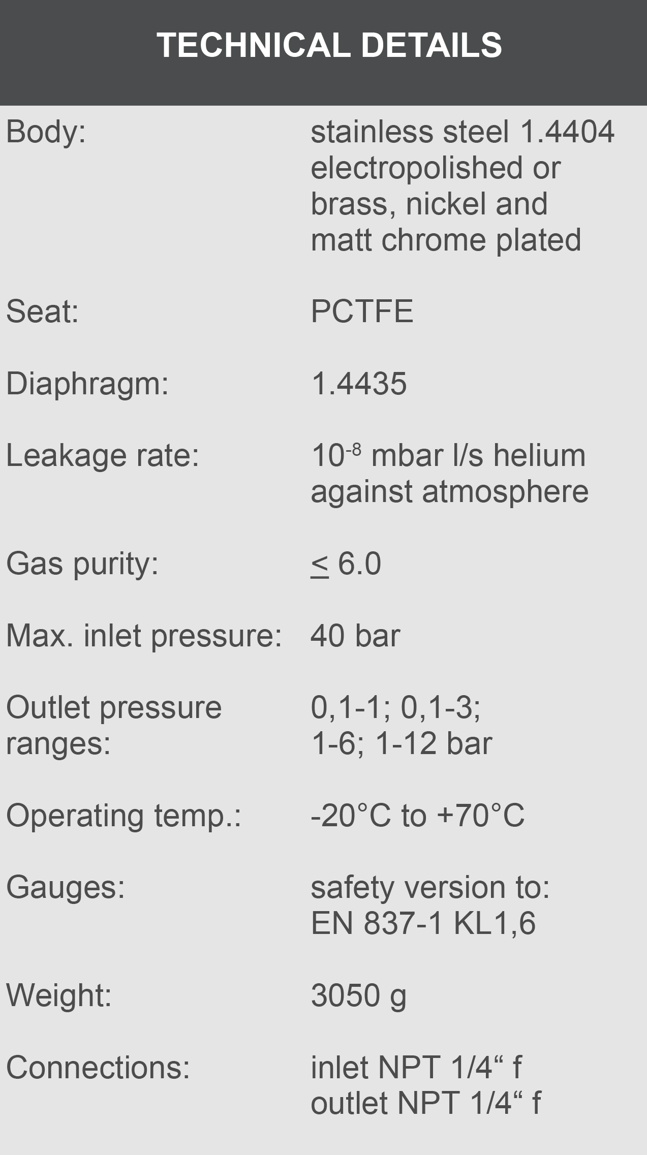 The HP 450 point of use regulator is fitted with a diaphragm shut-off valve, pressure regulator with pressure gauge as standard.
