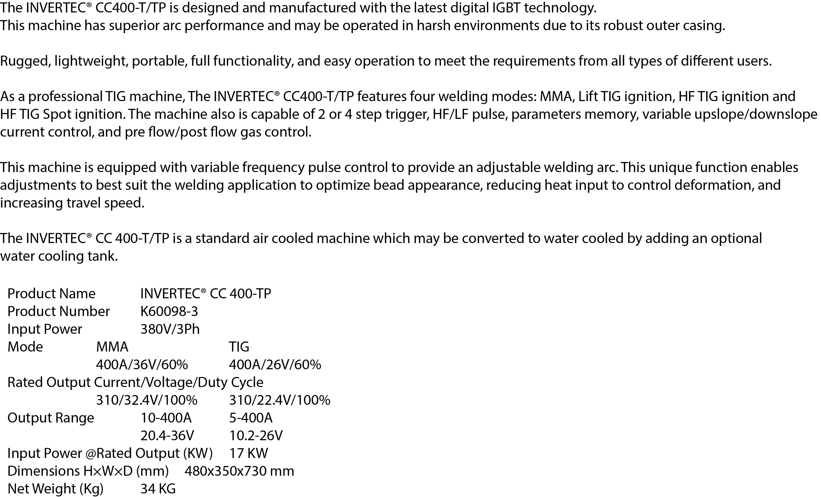 The INVERTEC® CC400-T/TP is designed and manufactured with the latest digital IGBT technology.