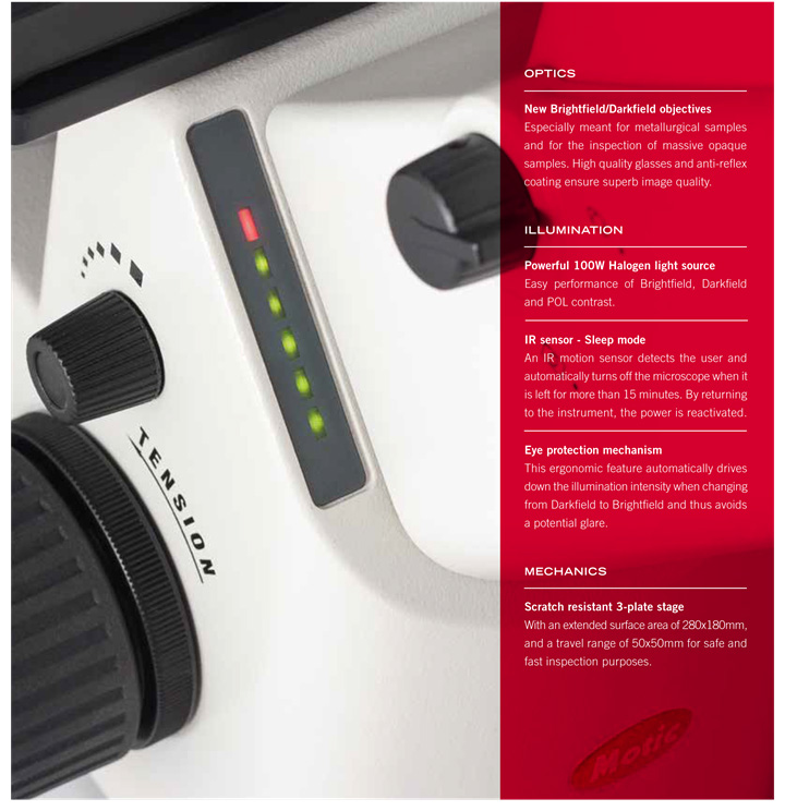 Inverted metallurgical microscope for the inspection of bulky samples in automotive-, machinery- and steel industry. Large metal pieces and die casting parts, too large for an upright microscope are easily examined to perform failure analysis, material research and quality control. The instrument comes without objectives to be individually equipped.