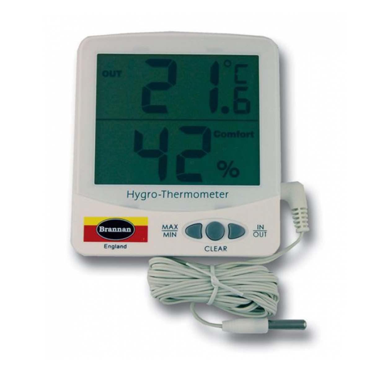 Jumbo digital max min thermometer featuring large displays for indoor temperature and humidity or outdoor temperature. Complete with 2 metre cable for the outdoor probe.