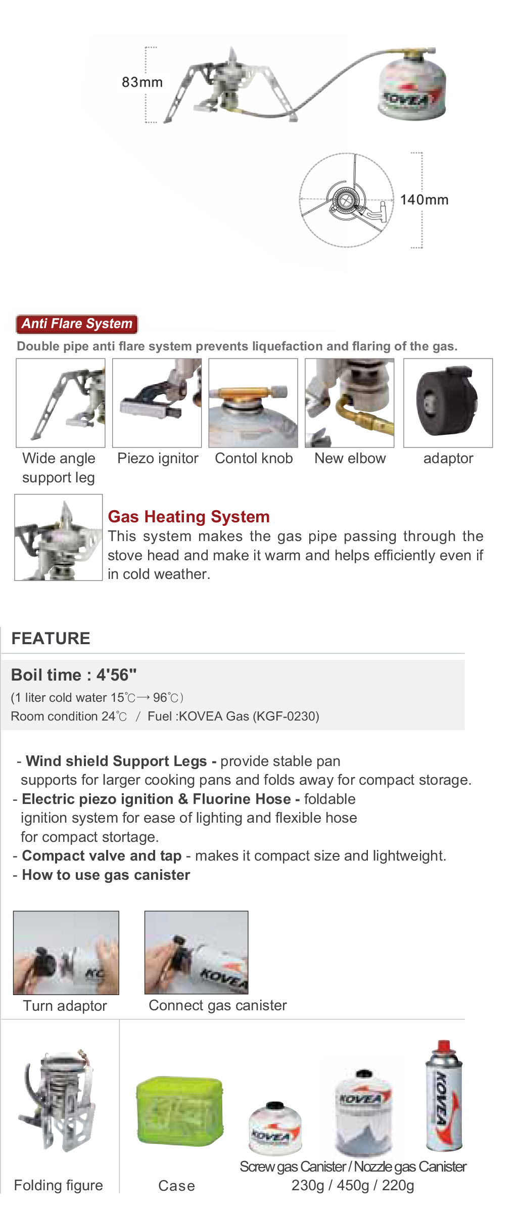 The Moonwalker has a double wall pipe, anti-flare system design doubly preventing cumbersome liquefaction. Its foldable legs allow for stability and compact storage. This stove uses a small flame control, making it more lightweight. The gas heating systems directs the gas pipe to pass through the stove, keeping it warm and efficient in colder temperatures.