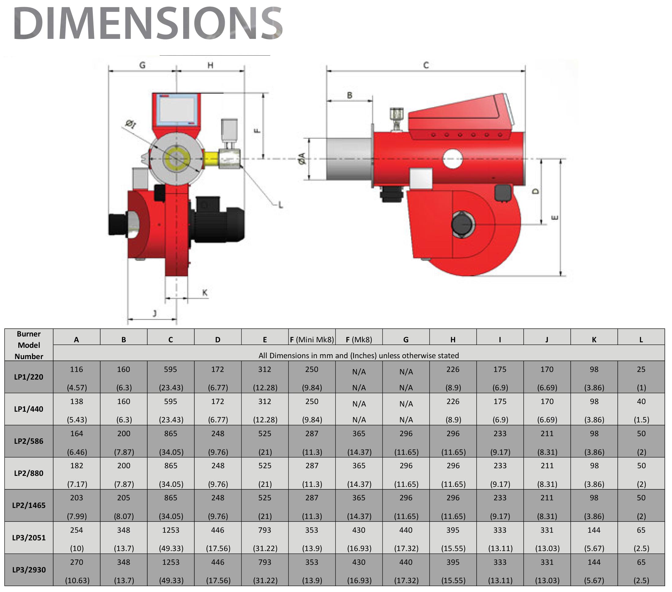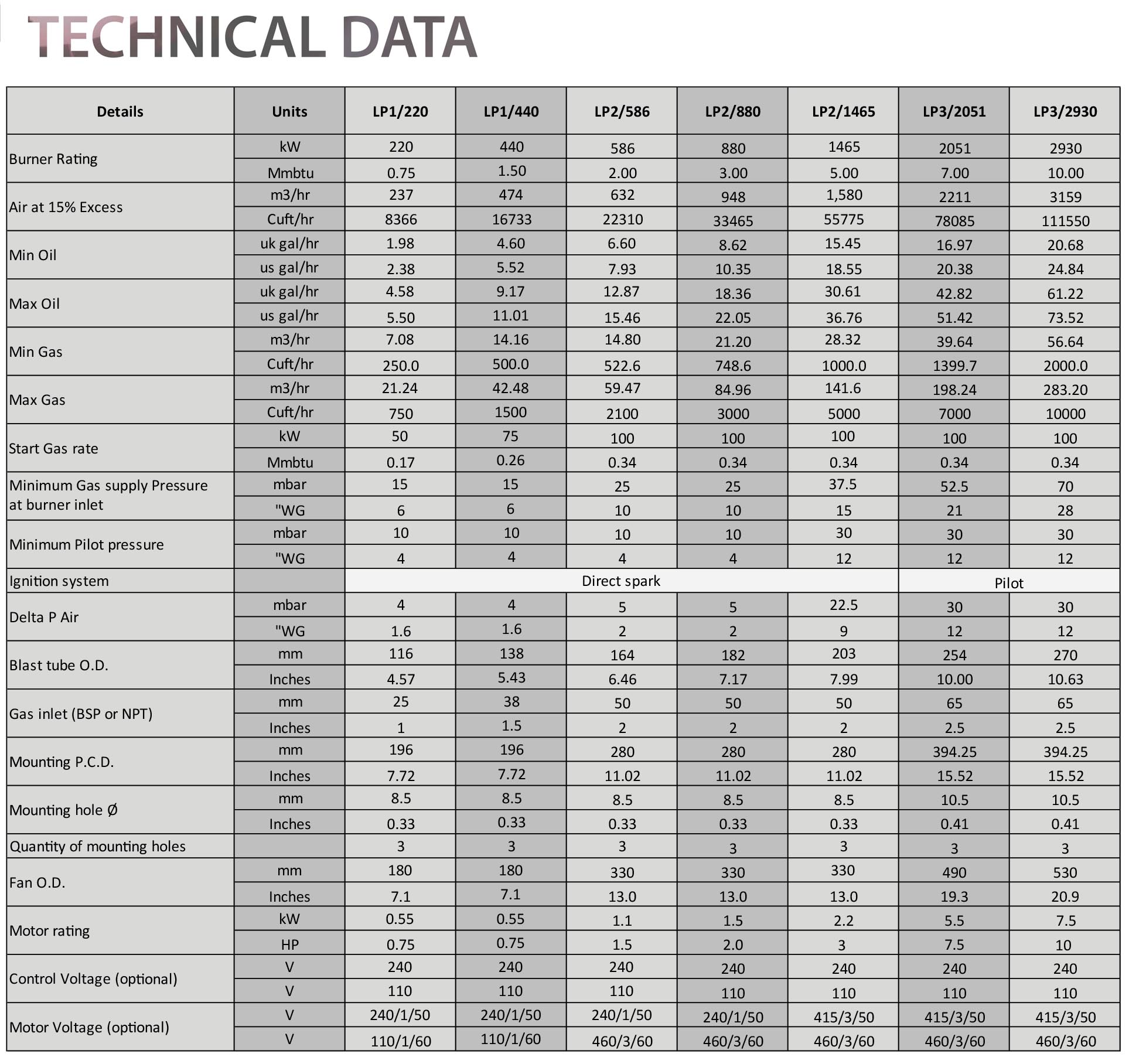 The LP burner series includes a built-in combustion air fan, designed and calculated to deliver 15% excess combustion air at a specified burner output.