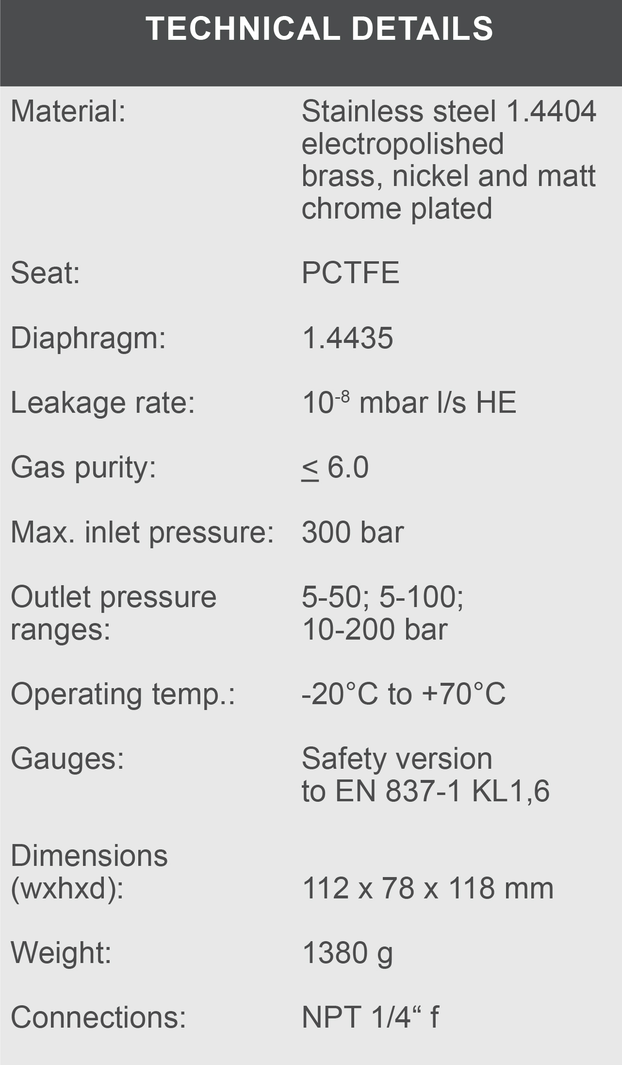 Especially for gases with high requirements of purity up to 6.0 for labratories and analytics.