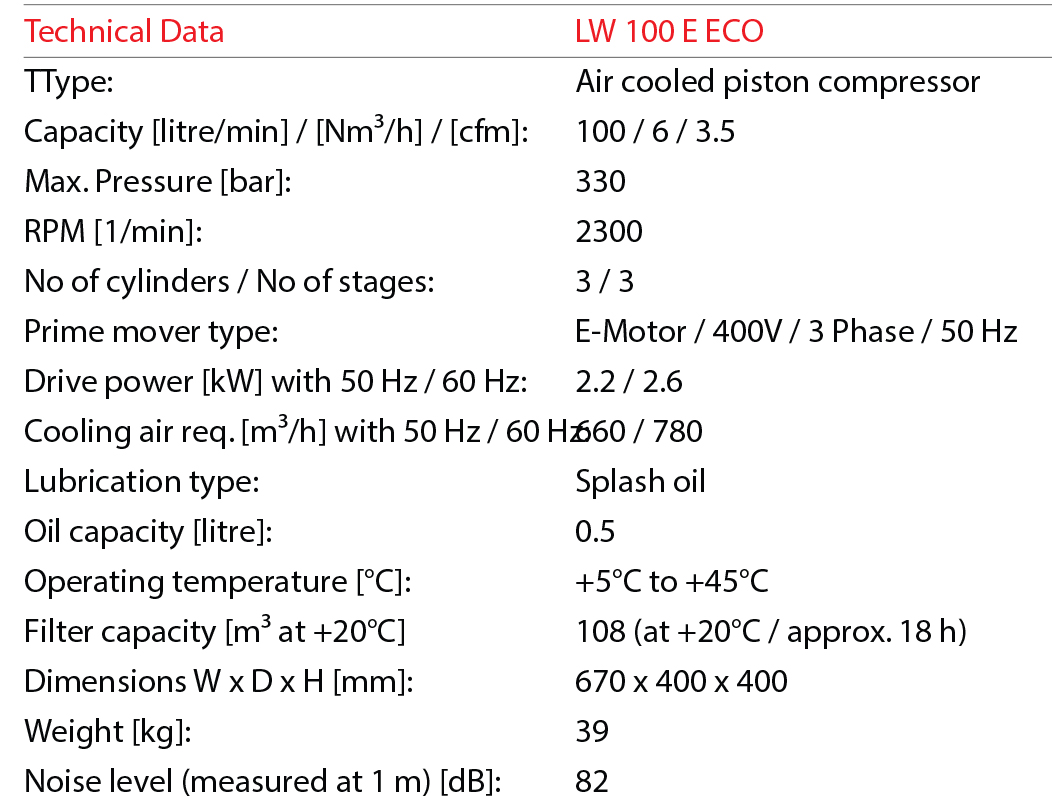 The extremely light, robust and reliable ECO series consists of 100% of the solid components of the LW 100 compressors as engine, compressor block, filter system and filling device. The LW 100 ECO convince our worldwide customers with its high quality „Made in Germany“. The hardened cylinder liners and the steel piston rings in all compressor stages ensure a long lifetime without loss of performance.