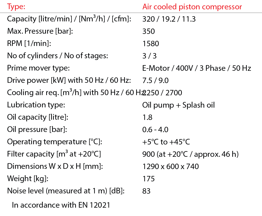 - Filling pressure to your choice (200 or 300 bar)