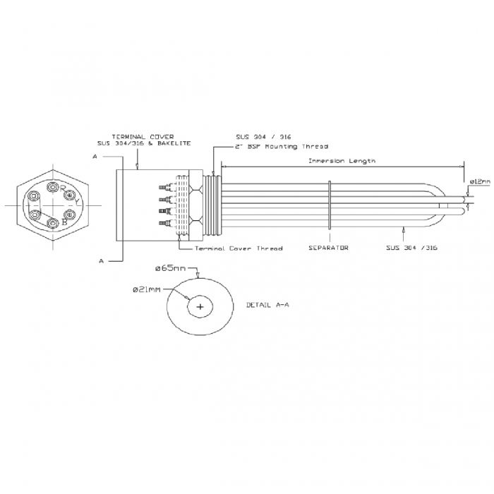 Metal Immersion Heaters (s/s 304, s/s 316, Titanium)
