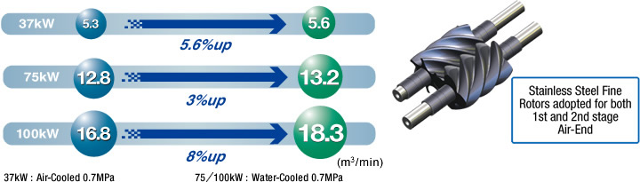 Responding to the load ratio of compressor, unnecessary compression is avoided by automatically lowering the unload start-up pressure. Energy-Saving is achieved. Taking 75kW water-cooled, 0.7MPa SPEC, Fixed Speed model as an example, in case of 70% load ratio 11.3MWh is saved annually, and in case of 90% load ratio 28MWh is saved annually.