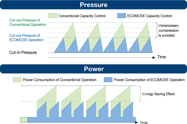 - ECOMODE : It monitors the air consumption and automatically adjusts the cut-out pressure for energy saving. This function applies to the standard, fixed speed models.