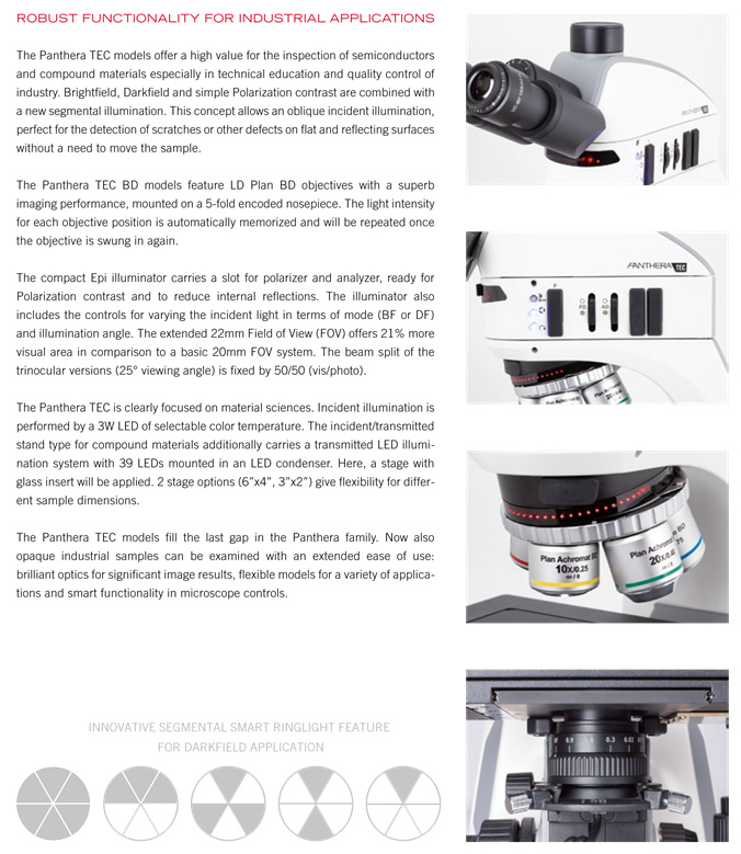 The Panthera TEC series of Industrial microscopes is the missing link in the Panthera family: Incident light microscopes for material sciences, ready to handle semiconductors, LCD panels and wafers with a clever Brightfield/Darkfield illumination concept. To extend the application fields for compound materials, microscope models with additional Transmitted light by integrated LED illumination can be chosen.