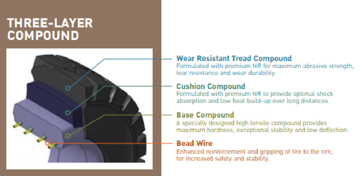 TOKAI SOLID TYRES CONSIST OF THREE-LAYER COMPOUND, GIVING TOKAI SOLID TYRES OUTSTANDING PERFORMANCE, HIGH WEAR RESISTANCE (DURABLE), LOW HEAT BUILD UP, EXCELLENT GRIP TRACTION AND ALSO MAXIMIZE THE SAFETY OF FORKLIFT & OPERATORS. FURTHERMORE, THE PRICE FOR TOKAI SOLID TYRES ARE FAIR AND REASONABLE.