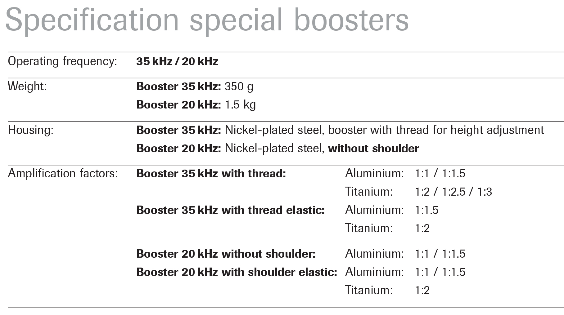 The standard boosters are suitable for the amplification of the amplitude of standard machines and special actuators.
