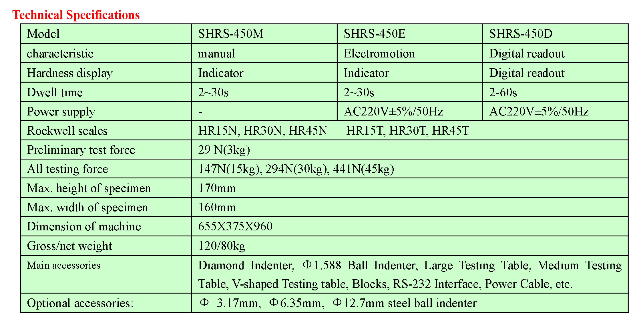 - SHRS-450M is an effective and affordable superficial Rockwell testing machine with high accuracy, reliability and durability, it is applied in the workshops and measurement departments for determining the Rockwell hardness of ferrous and non-ferrous metals.