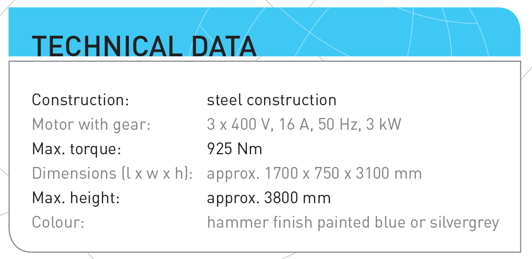 The unit disposes of a torque adjustment (0 – 925 Nm) and speed regulation (0 – 30 rpm). Cutoff is effected by torque control.